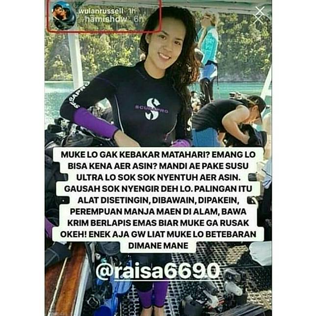 Yakni Raisa yang menjadi sasaran kekesalan Wulan lewat instagram story miliknya. Wulan mengaku tak suka melihat Raisa yang saat itu sedang melakukan aktivitas di bawah laut.